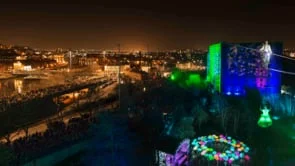 For the launch of Bristol Green Capital 2015, Sarah collaborated with Cirque Bijou to create this illuminated aerial costume. High wire walker Jade Kindar Martin braved an 100ft high wire on a bicycle with his wife Karine Mauffrey suspended beneath him as projections animated the buildings.